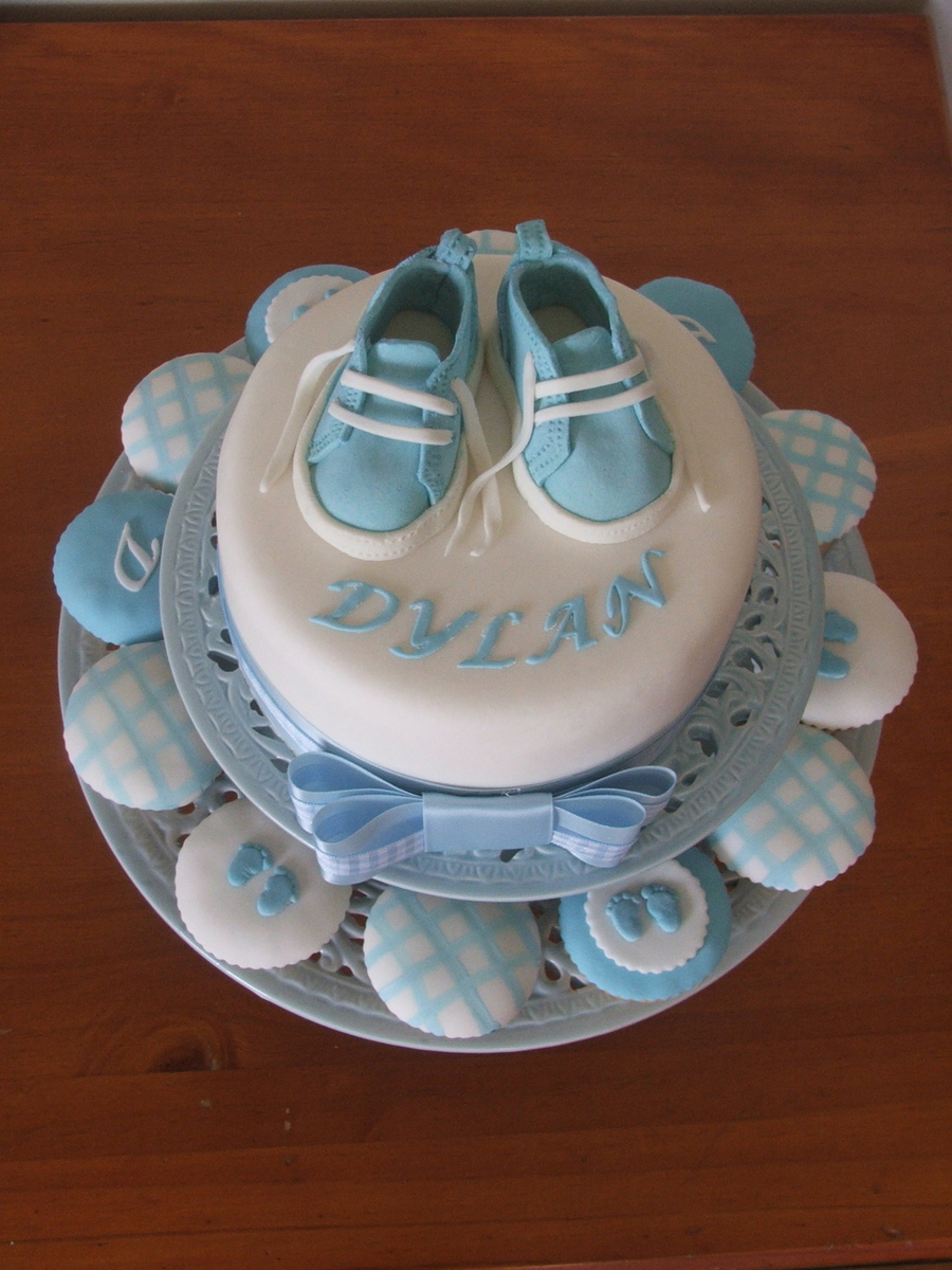Foam Topper made for display. Boots are gumpaste using pattern from CC. Cupcakes vanilla with fondant tops in various styles.