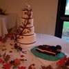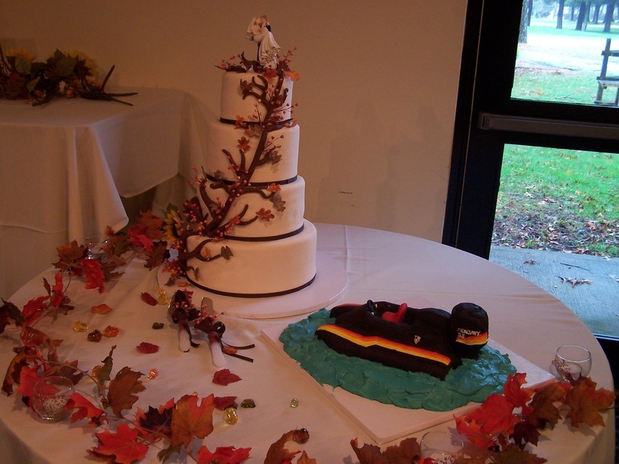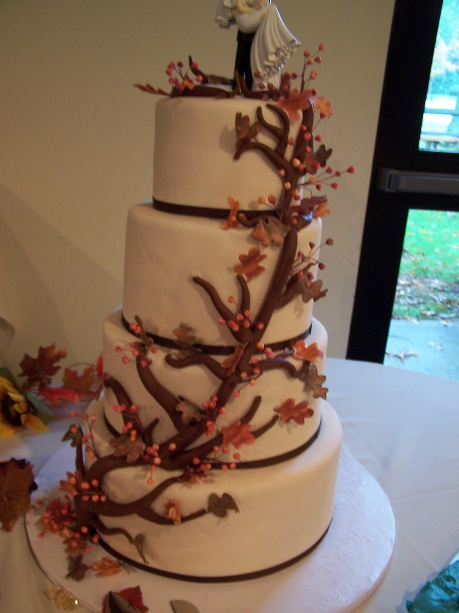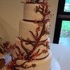 Had fun with this one. Modeling chocolate branches, gumpaste leaves & berries. I did not like the topper the bride gave me but made it work.