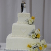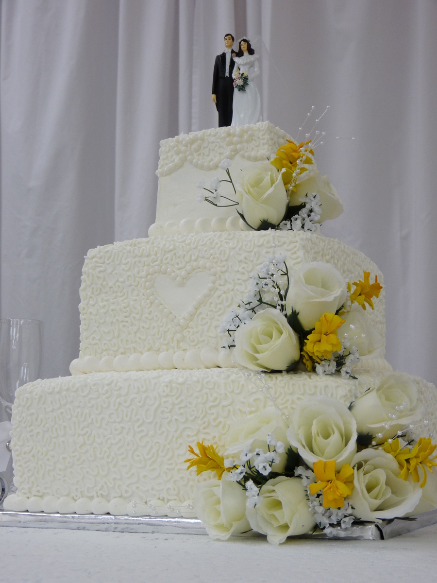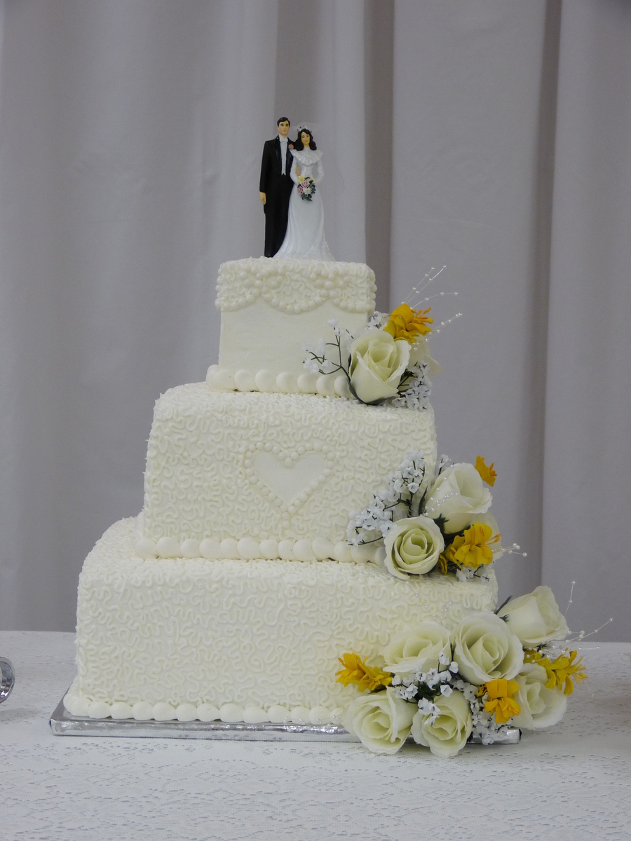 White cake w/ white chocolate ganache filling iced in buttercream. The flowers are the same silk she used in her bouquet.