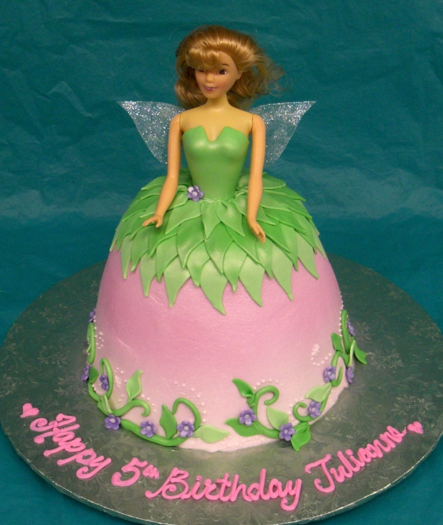 going for a tinkerbell theme. dress made out of a carved 6"7" &8" cake, green is fondant, pink buttercream. Airbrushed with some lustre spray. wings are non edible, made from mylar, brushed with blue piping gel and lightly sprinkled with disco dust.