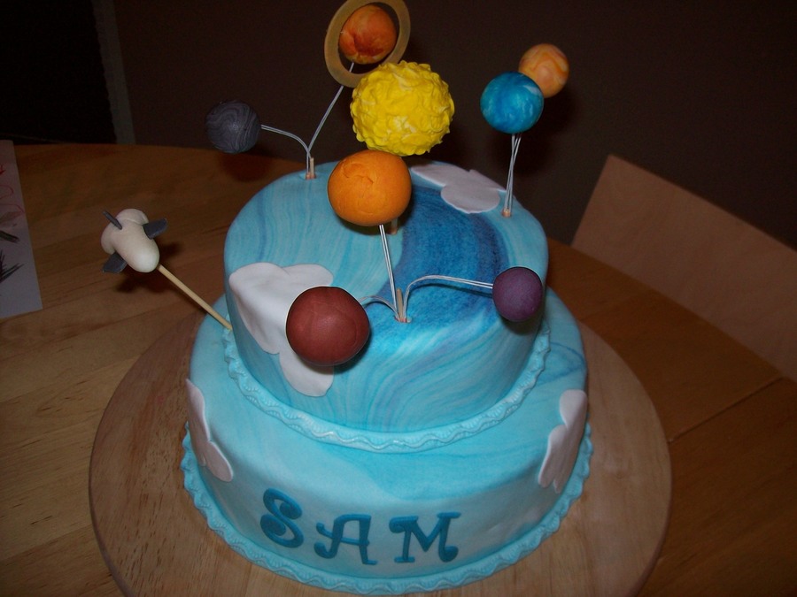 Wanted to make a cake with the milky way. I should have used a single cake. This way I could have had the planets on there on the same level. Now they would not stay... But it turned out neat anyway...