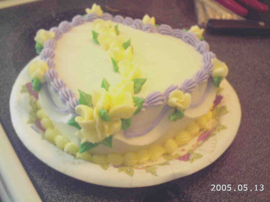 Ok, this one I know is difficult, but I just got my digital camera and at that time I was overwhelmed with all the settings. It is butter cream with yellow sweet peas and lavender borders.