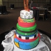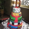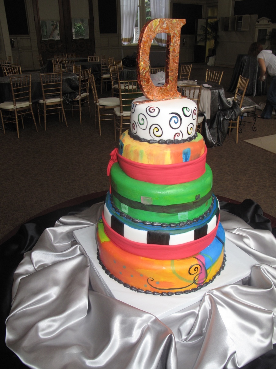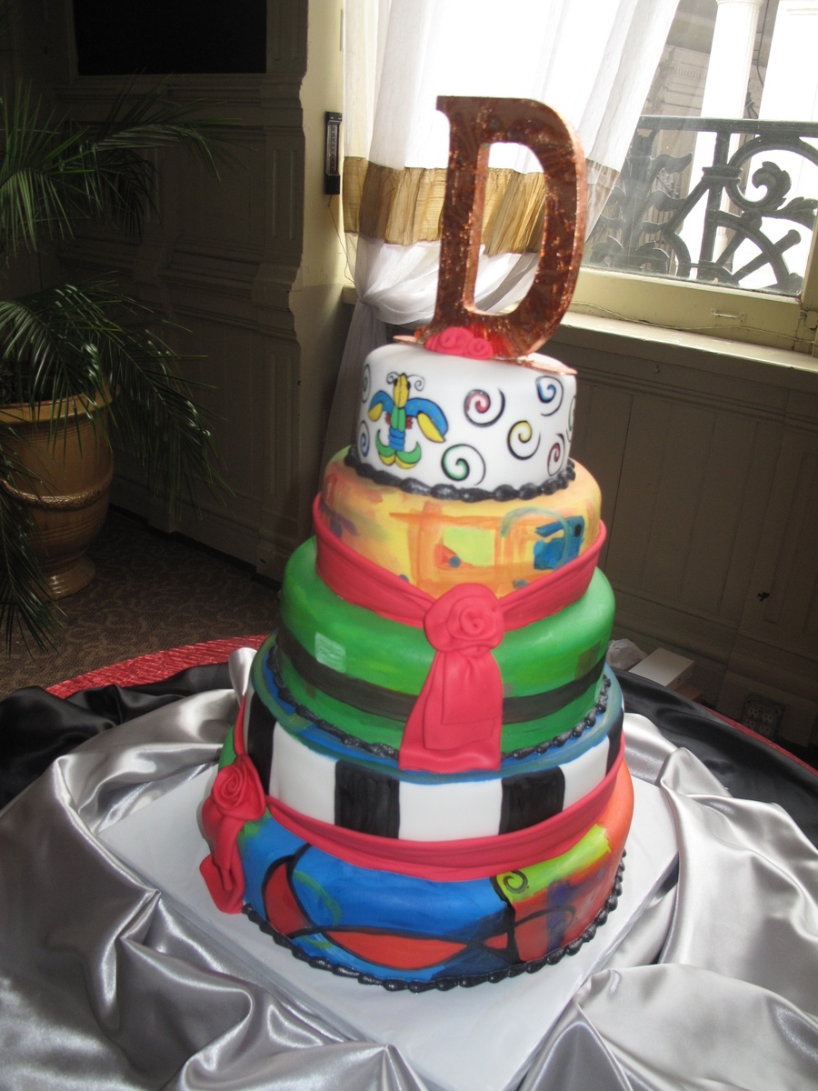 This is a cake I donated for a wedding anniversary. The husband was diagnosed with terminal brain cancer and they had planned on having a big celebration for their 10th anniversary, but with his diagnosis, a good friend of theirs organized a beautiful celebration for their 9th anniversary. She got everything donated, from the beautiful venue in down town NOLA, to the catering, photography, flowers, cake...literally everything. I was honored and pleased to be a part of it. He is an abstract artist, and I used his artwork as inspiration for the painting on the cake. The topper is one he made himself. 14/12/10/8 rounds. The cakes were coffee with pecan filling, chocolate with chocolate hazelnut filling, and lemon zest with raspberry filling. All covered in fondant and painted with a mix of gel color, americolor white, and vodka. You can see some pictures of the art that inspired it here:http://paulandlisa.weebly.com/index.html
