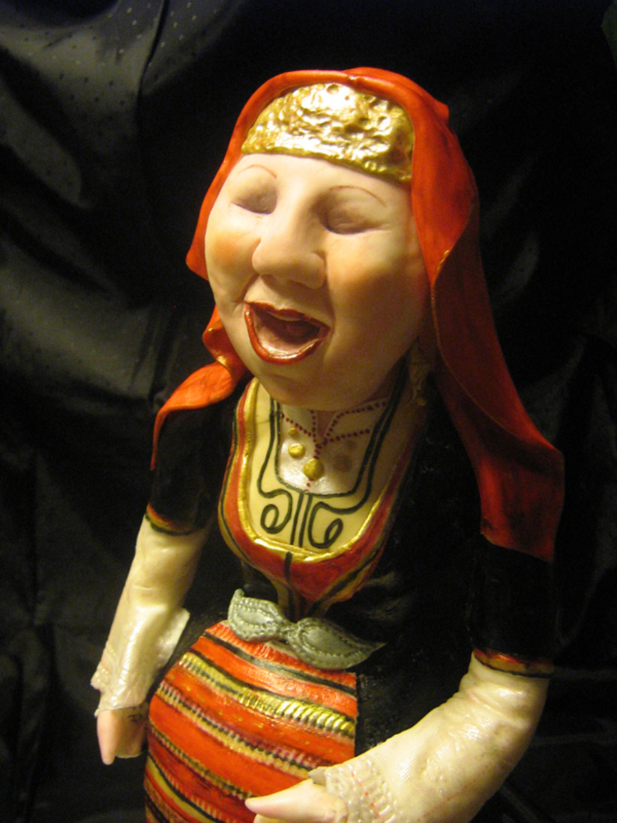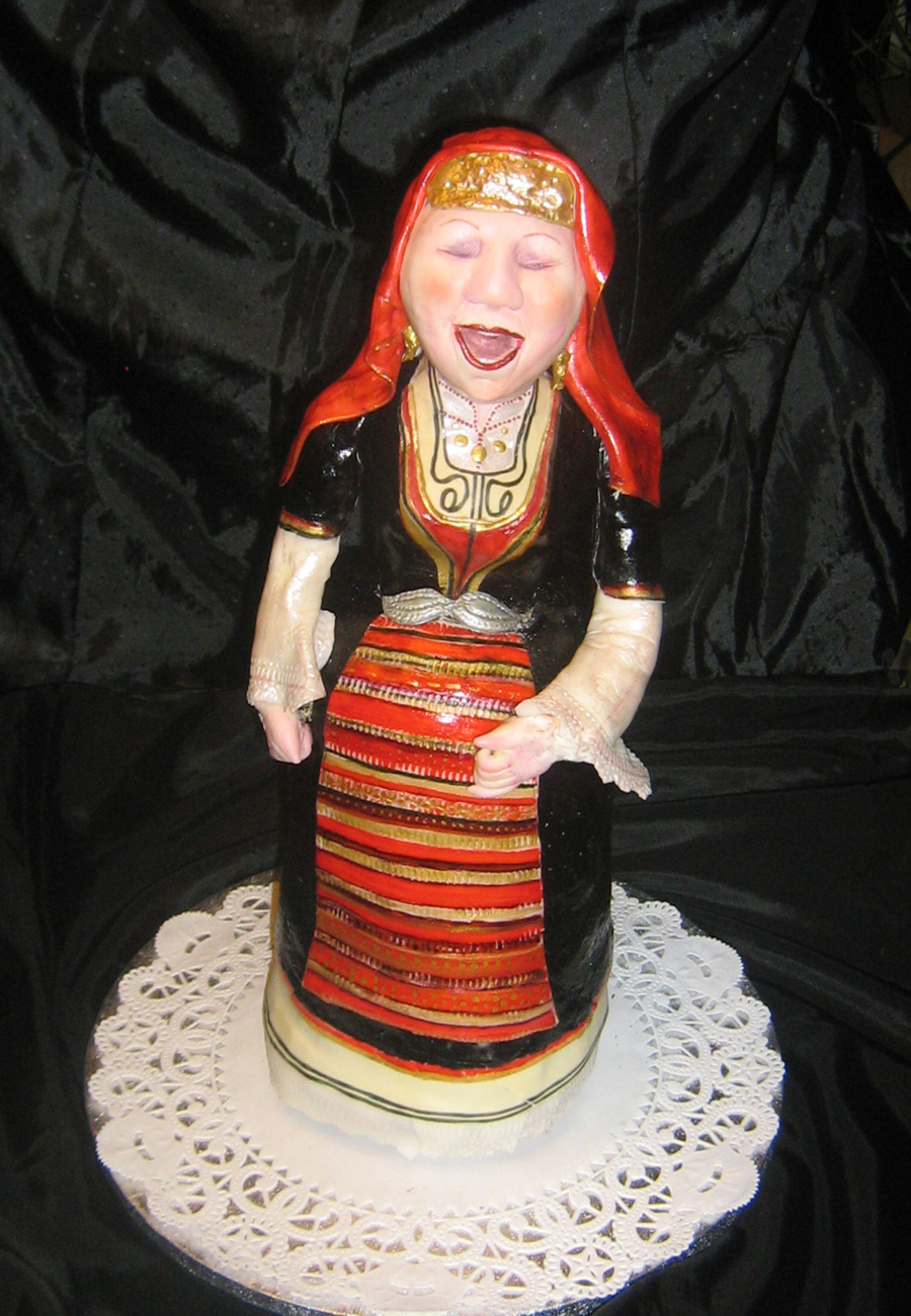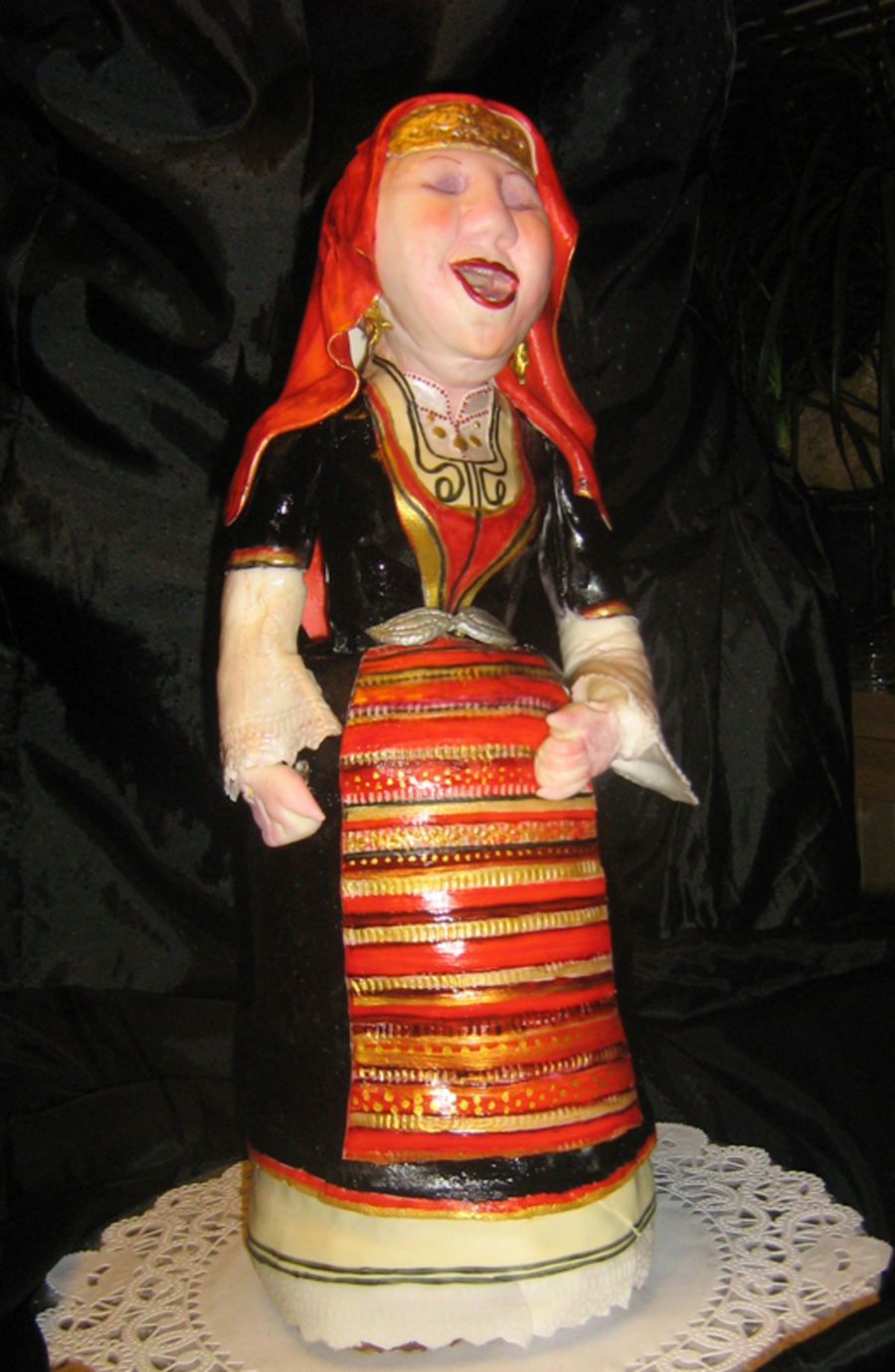 Made the grandma for the bake sale in our Bulgarian orthodox church :). Three tiny tiers of cake :), fondant skirts and scarf, fondant+gumpaste face, torso an sleeves. A skewer in the torso goes in the middle of the cake, almost to the bottom ....