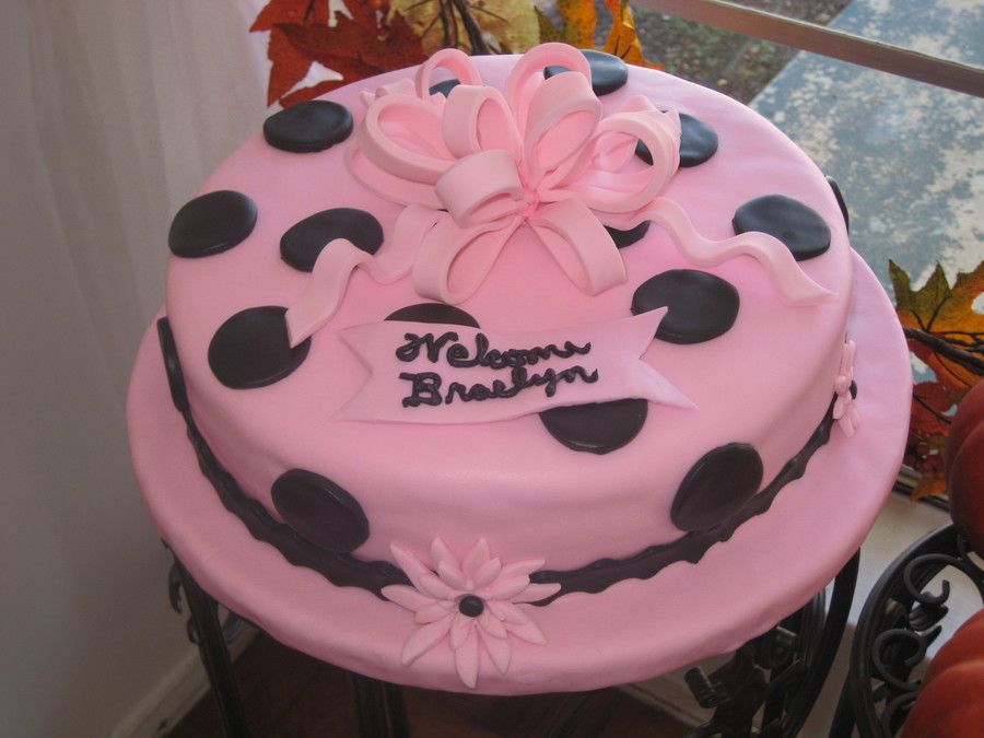 Cake was made to match the baby's outfit she would wear to the shower. It is a 10" round cake covered with pink fondant with black fondant dots. The bow and flowers are also fondant.