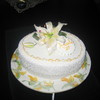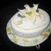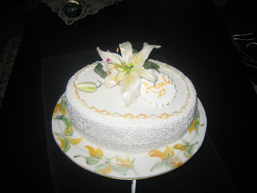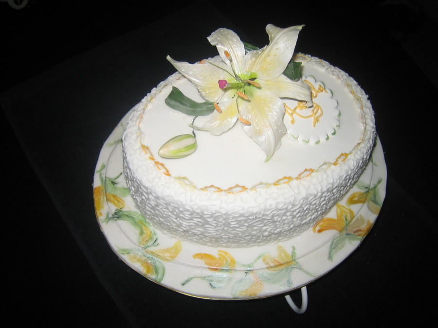 Gum paste lili, Royal Icing lace pieces, fondant covered with cornnelli lace. painting of flowers on the botom