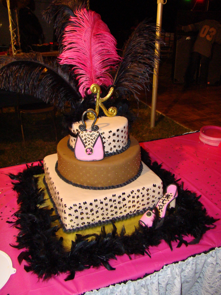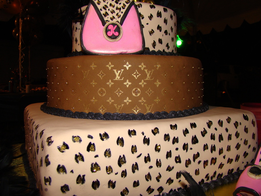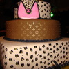 Hand painted leopard bottom and top, Louis Vuitton middle. White almond on bottom, key lime in the middle, and red velvet on top. Gumpaste shoe, purse, and "K" on top. Disco dust in the middle of every leopard spot - gold dragees in the middle of symbols on middle tier. Ostrich feathers on top. Very, very fun cake to make!!