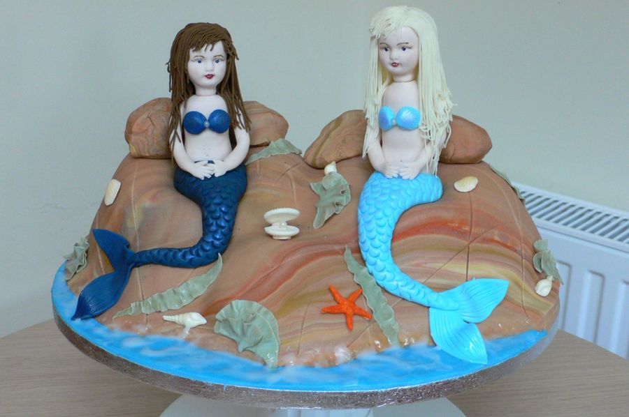 I did this cake with pink mermaid tails a few weeks ago, whilst at the party 2 more little girls having a joint party this weekend put in their order!. They chose the colours of hair and tails. Cakes made in pudding basins and then covered in sugarpaste. All completely edible.