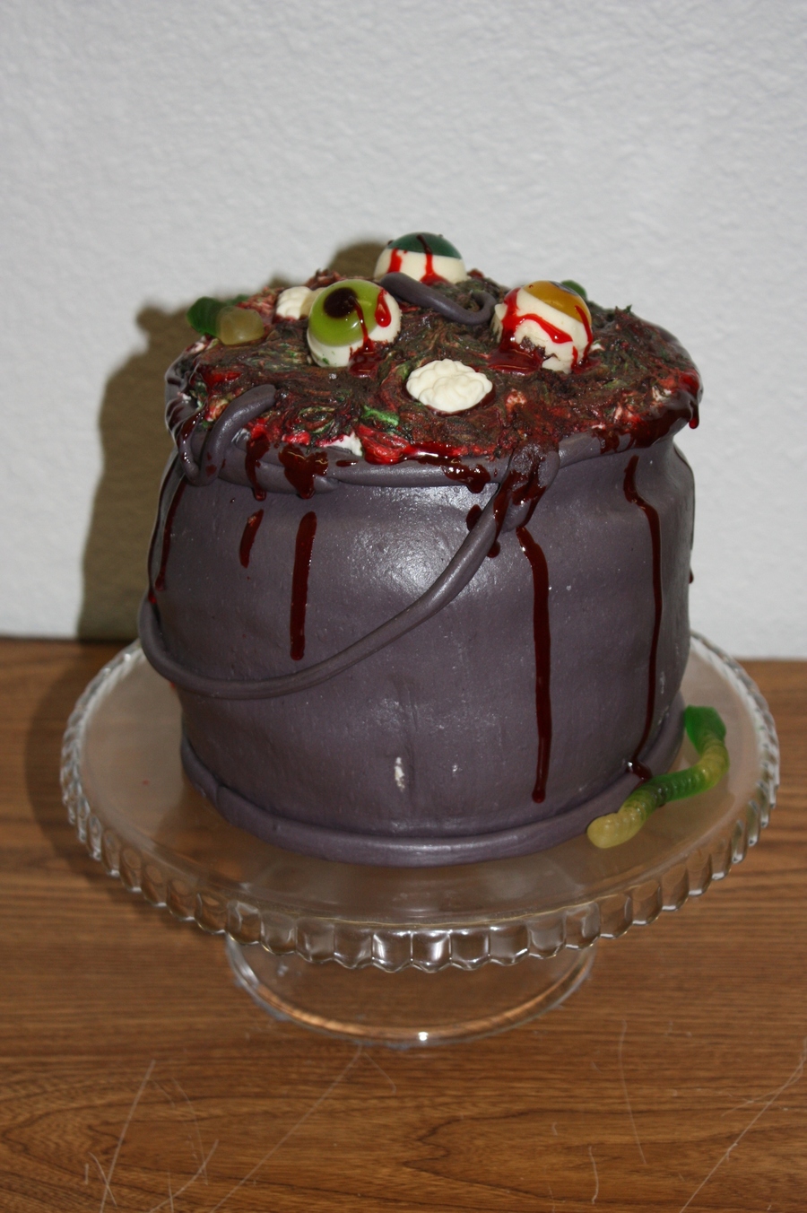 Witches cauldron with bloody eyeballs, rats tails and brains. Ewwww. Really gummy eyeballs and brains, fondant rat tail and piping gel for blood.