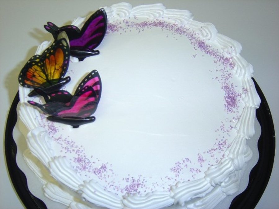 8" round whipped bettercreme frosting and colored sugar with butterfly pics