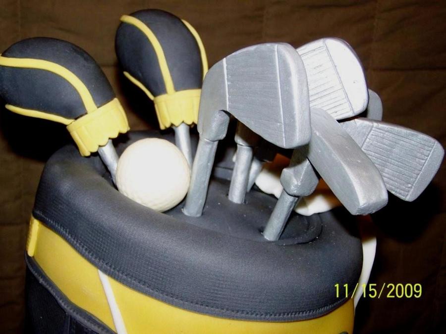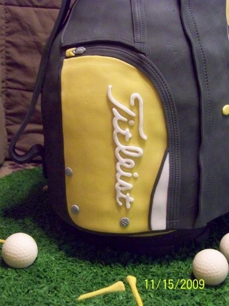 1st attempt at a golf bag. This was for a retirement party. Golf bag is fondant over mostly chocolate cake. Golf clubs: heads were gum paste attached to fondant covered dowel rods. Tees were gum paste. Golf balls were white chocolate , (used a mold for these). Titleist logo was cut out of rolled out fondant. Texture on the golf bag was made from rolling some screen cloth on top of the fondant to give it a vinyl appearance.