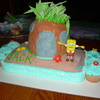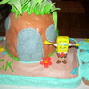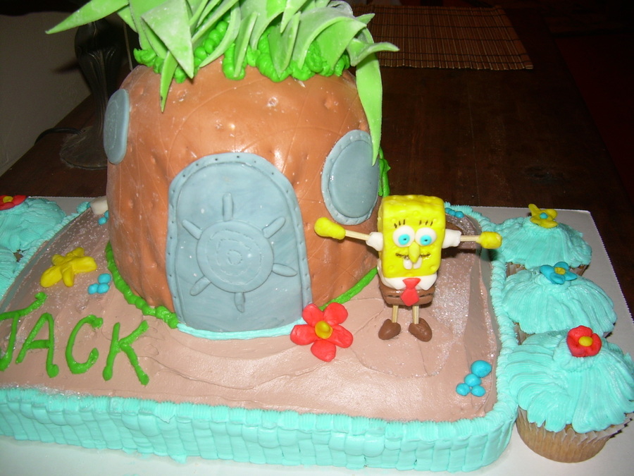 I used confetti cake mix for the cake and buttercream icing. The pineapple was made with a small, round pan as the base and half of the sports ball pan for the dome top. I handmade the Spongebob from fondant and used bamboo skewers for arms and legs. Since it was for a 3 year old's party, I added the cupcakes to make it easy on the mom if she wanted to serve those for the kids.