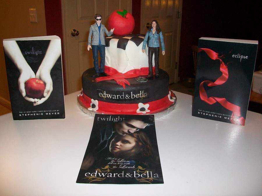 Cake was vanilla with the top layer dyed in red coloring (see next picture). Vanilla buttercreme frosting. Fondant is vanilla at the top and chocolate at the bottom. If you are a Twilighter, you will understand the significance of the apple, the frayed red ribbon, the swirling white fondant, and the chessboard. Bottom layer was also dusted with silvery sprinkles. Only a Twilighter would understand why. :-) Add a caption Twilight cake done for a 12 year old's birthday party. Cake was vanilla with the top layer dyed in red coloring (see next picture). Vanilla buttercreme frosting. Fondant is vanilla at the top and chocolate at the bottom. If you are a Twilighter, you will understand the significance of the apple, the frayed red ribbon, the swirling white fondant, and the chessboard. Bottom layer was also dusted with silvery sprinkles. Only a Twilighter would understand why. :-)