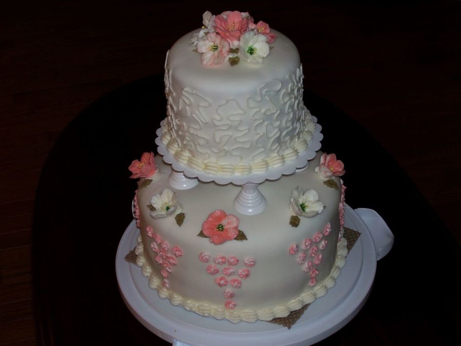 This is the final cake I did for course III - it took 2 times to get the fondant right on the bottom tier! The top tier is chocolate cake with peanut butter cup filling, the bottom tier is bride's white cake with pineapple cream cheese filling. Covered in fondant and royal icing flowers.