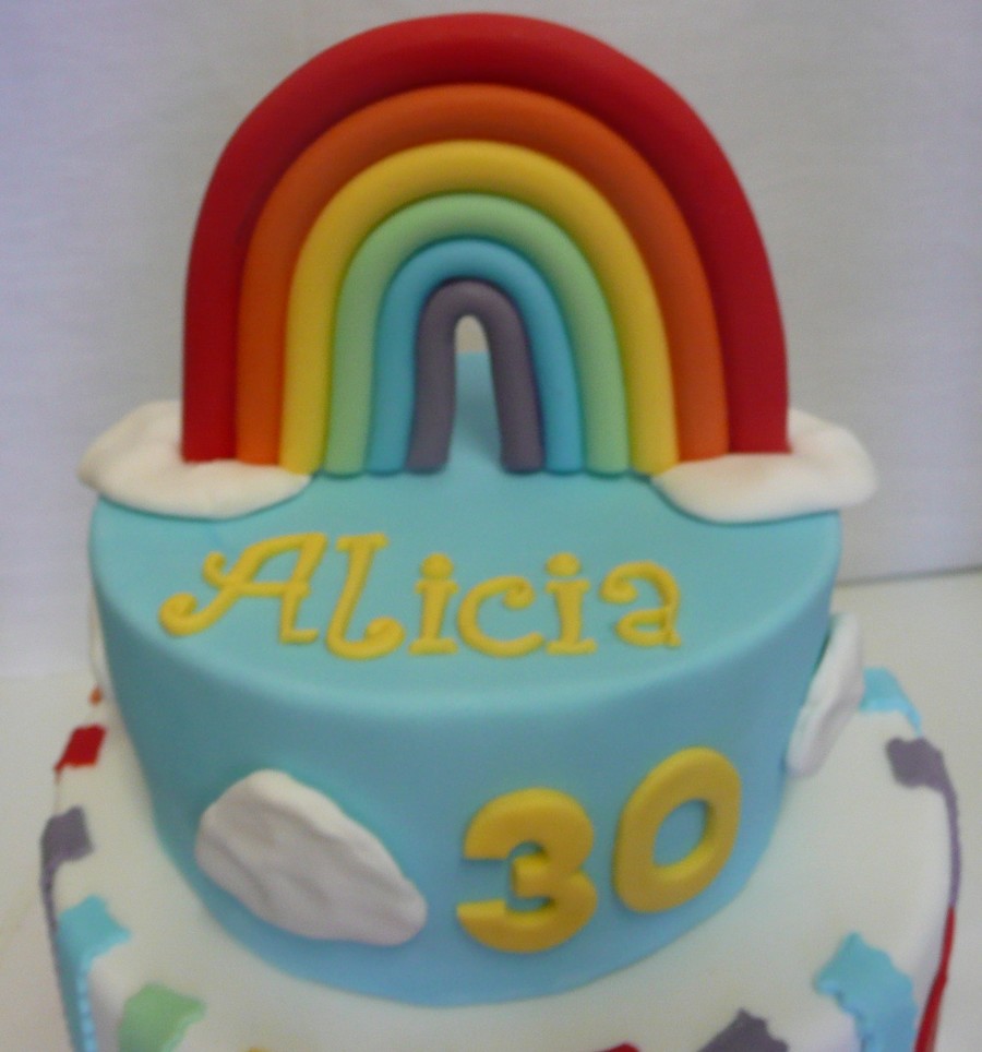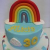 My cake for my 30th (next milestone someone else can make it for me!!!). I asked my friends what represented me and they all said rainbow (as I do meditation and rainbow colours = chakras) so here it is! Bottom tier was White Choc & Raspberry Mud with white choc ganache and top tier was White Choc and Coconut Mud with chopped Bounty both in the batter and the ganache! I made the Rainbow from Fondant and dried it for a couple of days.