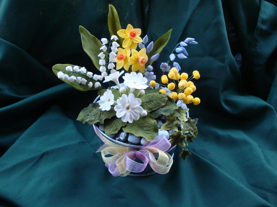 For my course, I have finally completed this project. The flowers are Lily Of The Valley, yellow Daffodils, Bluebells, Mimosa, Primroses, and English Ivy. The pebbles are also handmade from gumpaste. Thanks for looking.