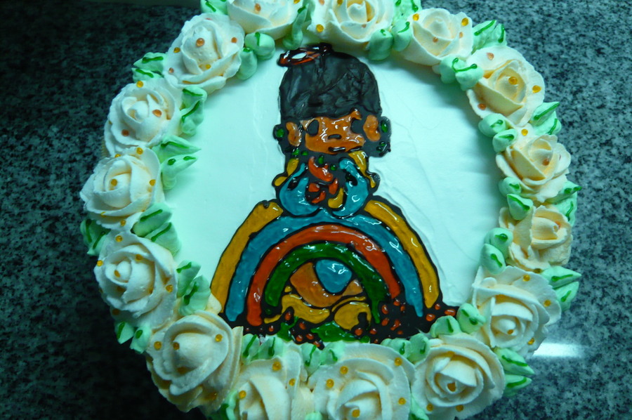 Vanilla spongecake with yam filling and decorated with roses.