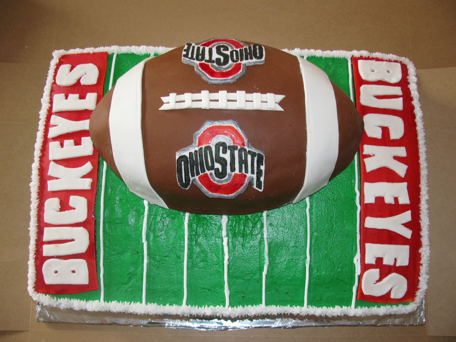 I made this for a co-worker of my husbands, she wanted a football cake for her boyfriend who LOVES the Buckeyes and thanks for all of the inspiration from CCers and especially Rothells (based my cake off of her Kansas cake) as well as her help, this is what I got. Cake is decorated in BC with fondant Buckeye endzones and the football is all fondant. TFL