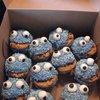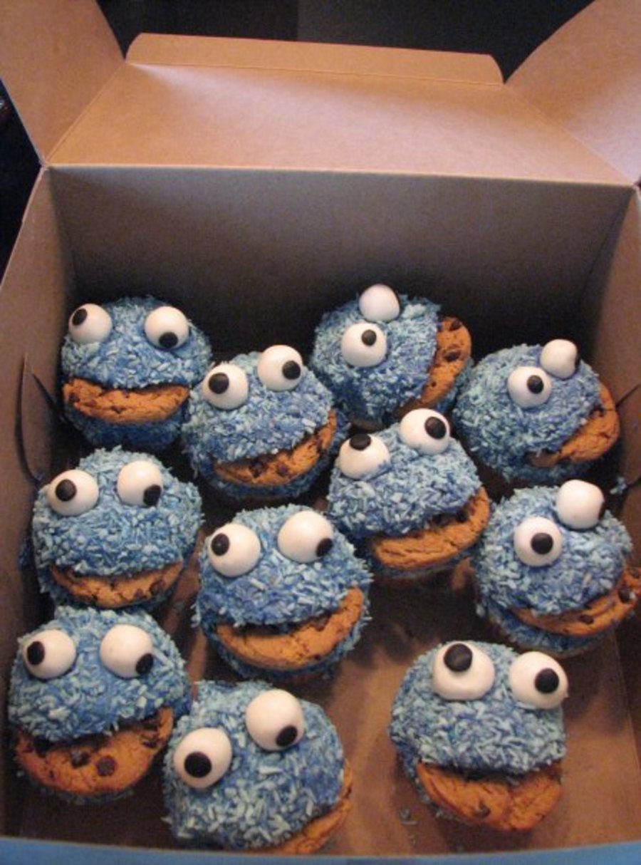 White cupcake with buttercream icing, colored coconut, fondant eyes, and a half a chocolate chip cookie! I've seen many pictures of cupcakes like this, and now I had an order for them. =D