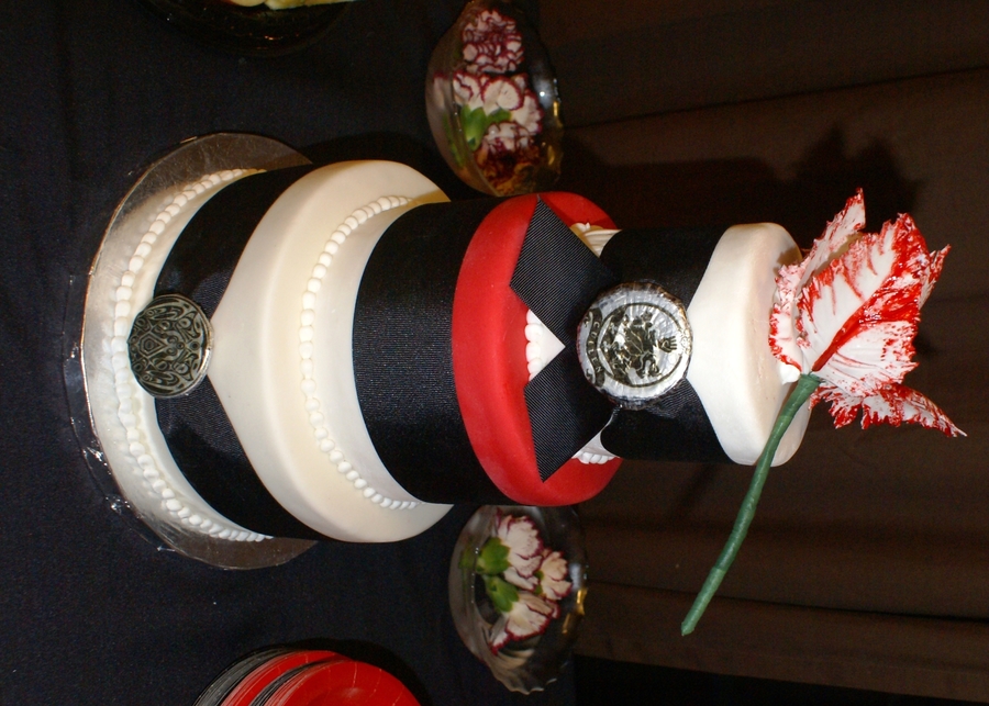 This cake represents Bella being caught between the two men she adores. The Cullen crest represents Edward and the "life" she could have with him (also reminiscent of Alice's Cullen Crest necklace worn in the movie). The other image, the tattoo every member of the wolf pack shares, represents Jacob and the life Bella would keep if she chose him. The middle tier is blank, in a way, but also "torn" with the two colors. The actual cake was red velvet with chocolate mousse, buttercream and fondant. Tulip was gumpaste, ribbon and buttons were real and hand-made.