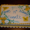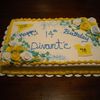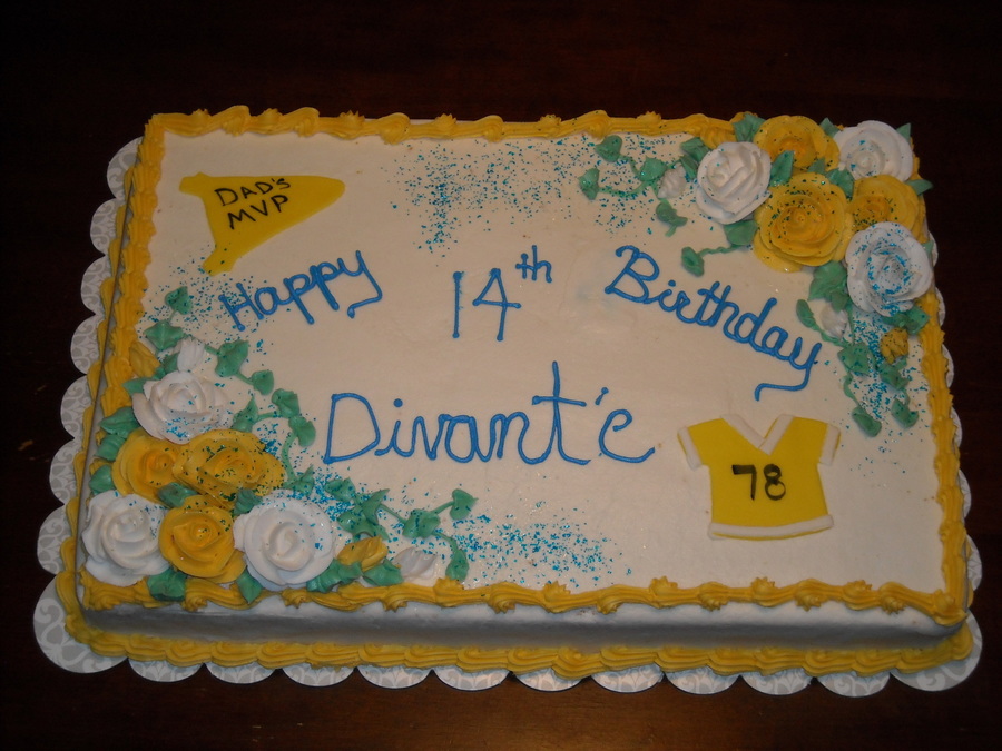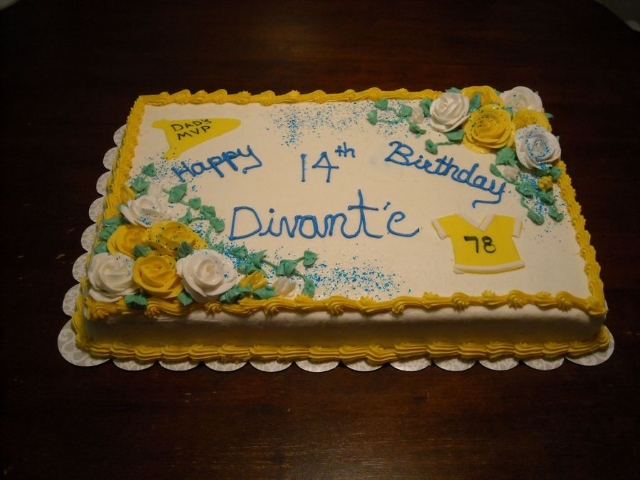 marbled cake, yellow and milk chocolate, with buttercream icing and decorations. shirt and banner made from fondant.