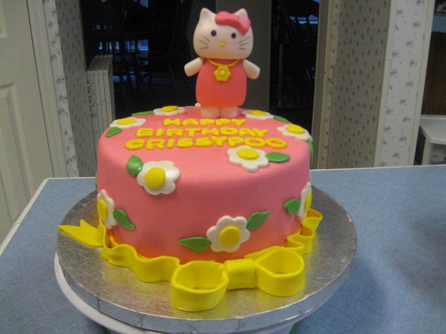 3 layer chocolate cake with buttercream filling. Cake is covered with fondant with gum paste Hello Kitty and bow. Flowers are fondant.