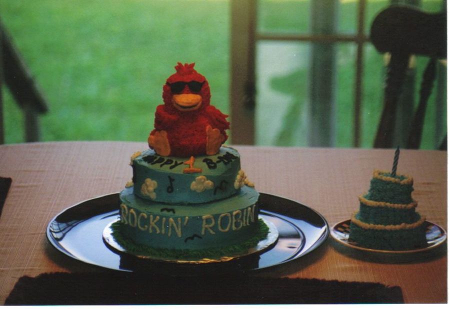 I made this cake for my nephew's first birthday. I got the idea from his grandpa because he always sings the song Rockin Robin to him. I also made a small smash cake to go along with it. My nephew had a fun time getting the blue icing everywhere!