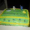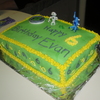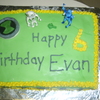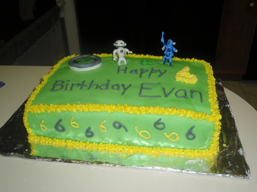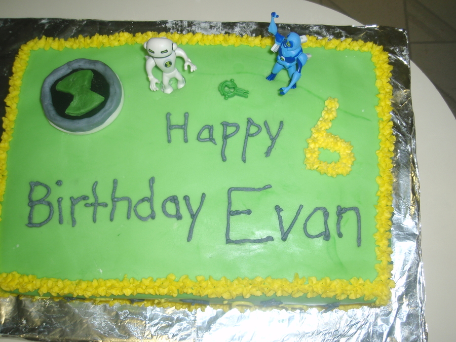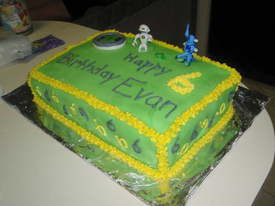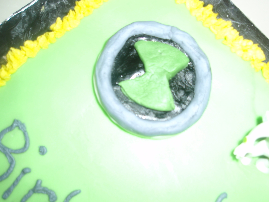 This is my sons Ben 10 cake for his 6th birthday. Green fondant and yellow bitter cream frosting. This is my first cake using fondant.