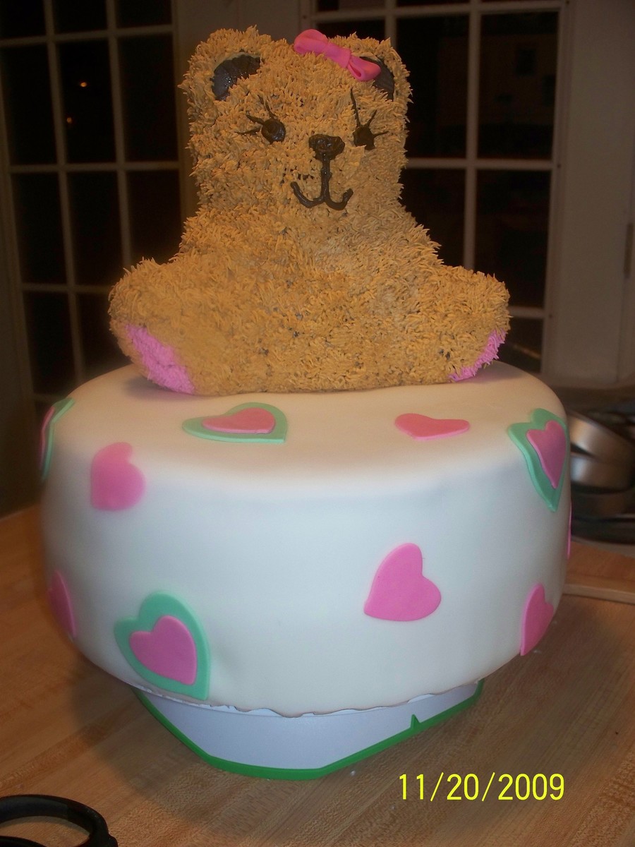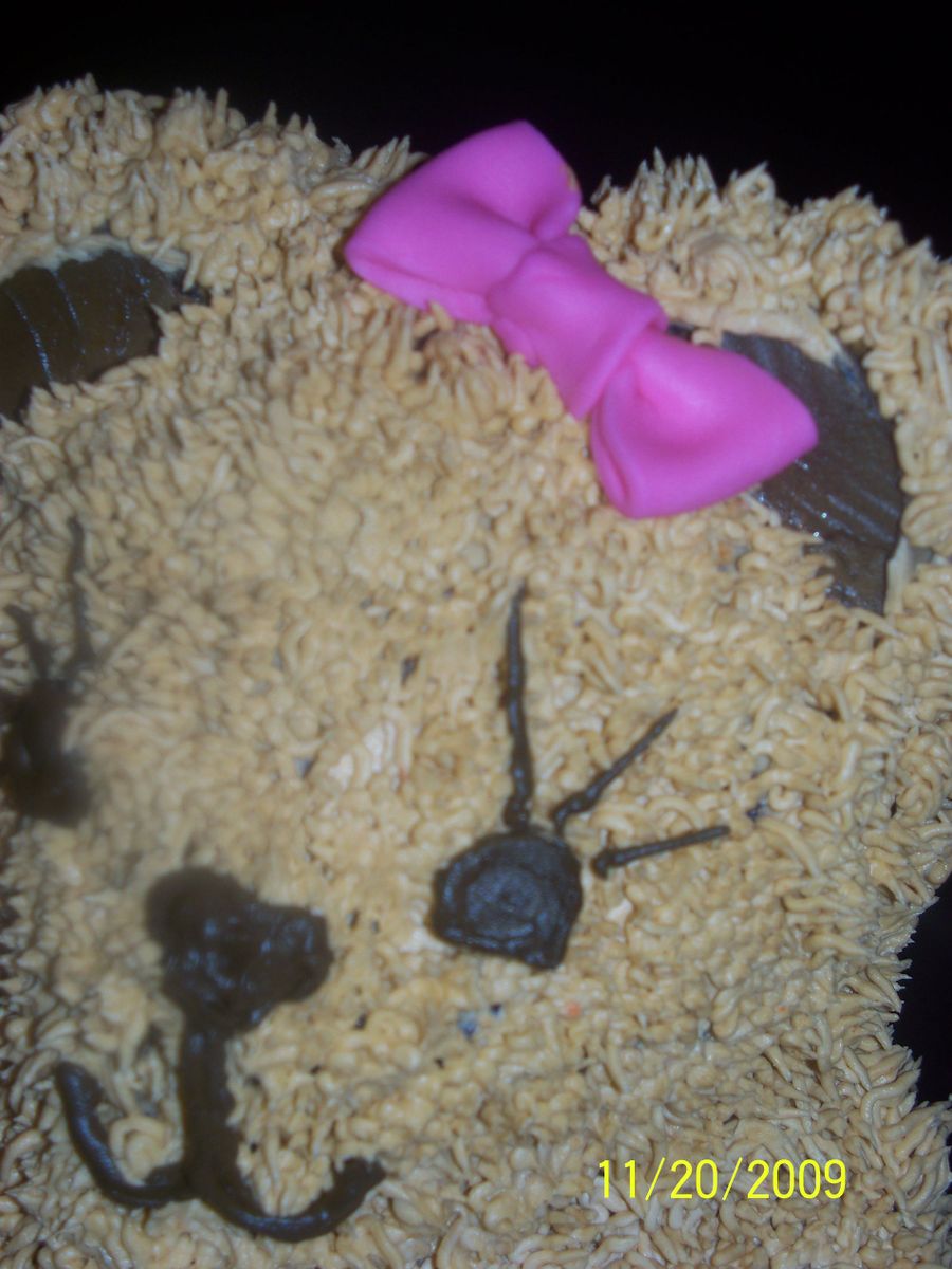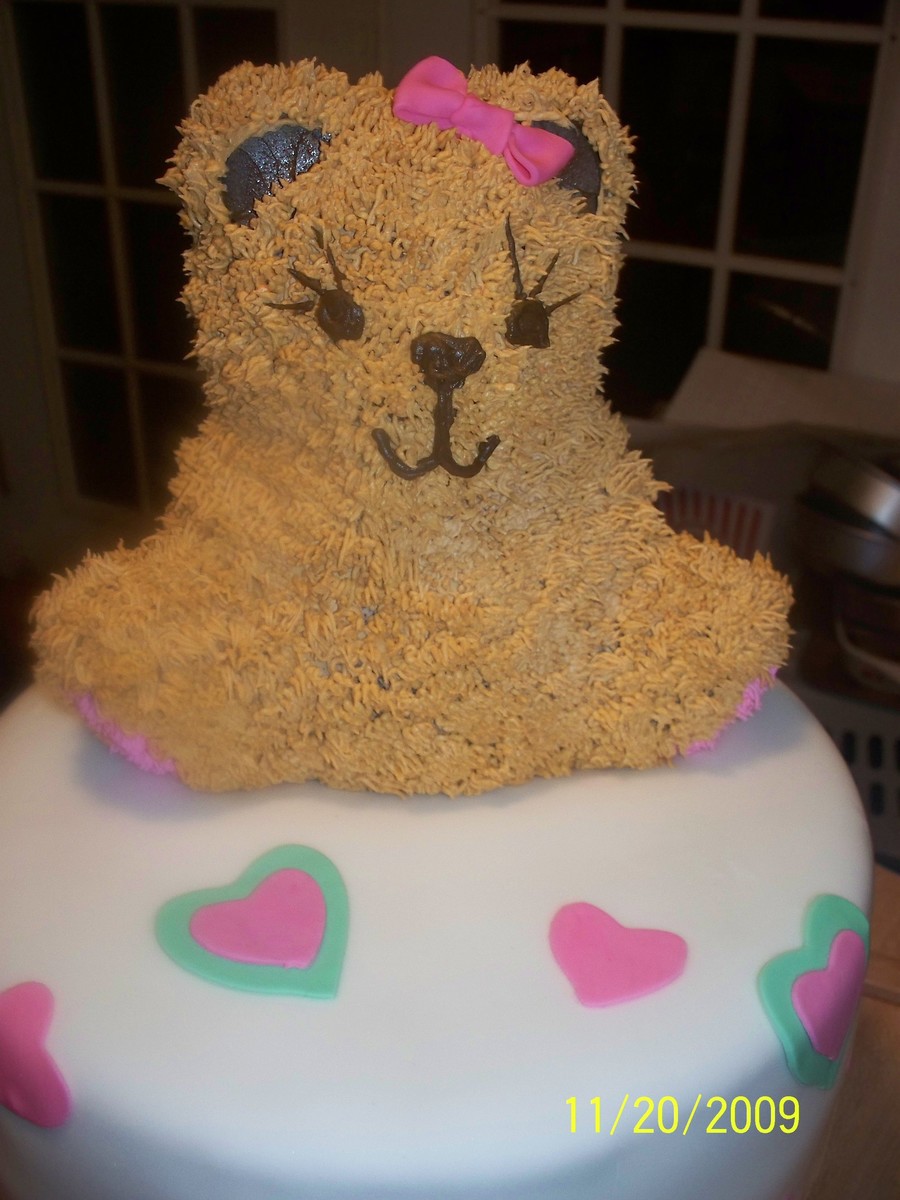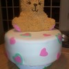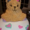 Used Bear pan for top first time that I have had a little trouble with the face. Tried to match it to a picture online of the decortions that she has. Bottom fondant with buttercream under , I tried making the butter cream a little thicker cuz my family does not like the fondant ended up with a little trouble with sliding