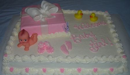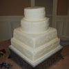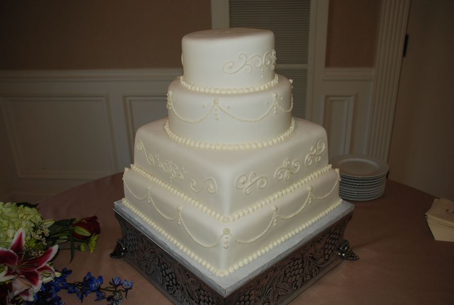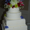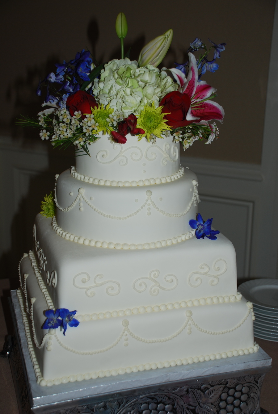 This is a 14", 12" square and a 10" and 7" round, all white cake, iced with BC and covered with MMF. The piping and borders are BC. The flowers are fresh flowers. TFL!!!