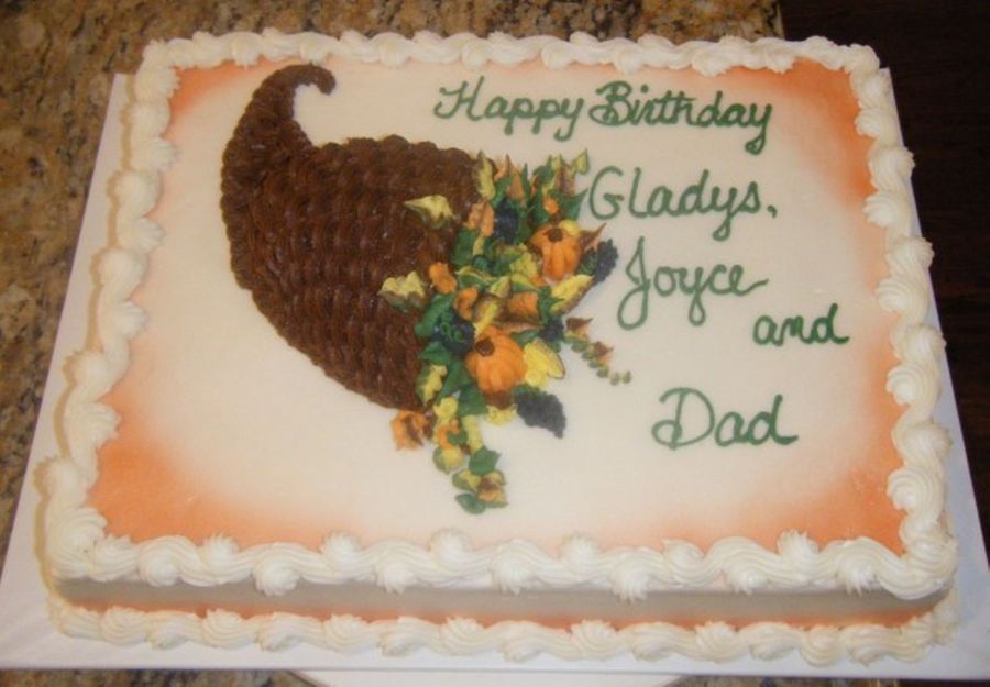 12x16x3, carrot cake with cream cheese frosting. Cornucopia is carved from carrot cake too (no easy feat!).