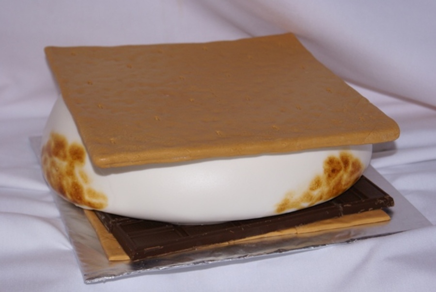 I LOVE smores so when a lady asked me to make one for her daughter, I jumped on it. Fondant covered cardboard top, mmf covered vanilla cake, torced for the browning effect, even smelled like a smore when browning! And real chocolate underneath. 12X12, and weighed about 10 lbs