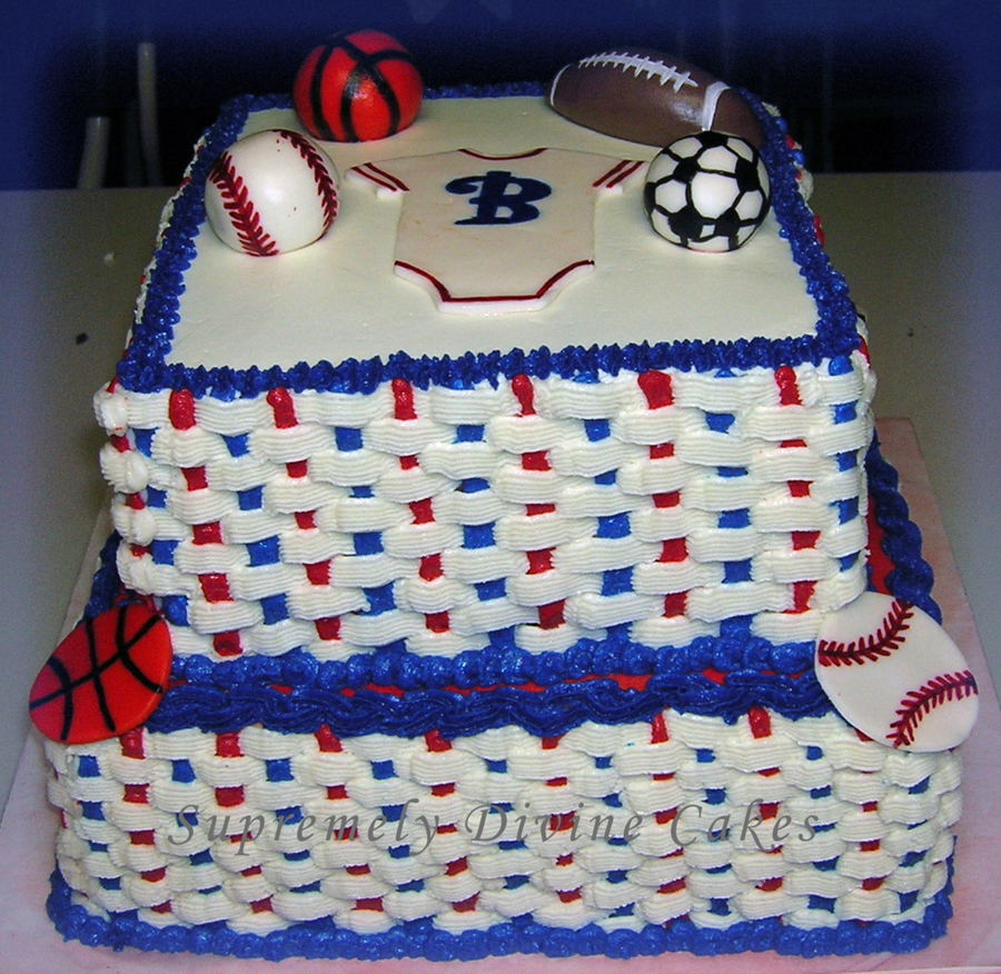 This cake was for a sports themed baby shower. Had nothing to go on except the colors blue and red, and since I have had bad experiences with using dark colored icing and it tasting terrible, I decided to go with the basket weave and the fondant stuff. This was my second attempt at basket weaving, and I must say it is an improvement from the first basket weave I did. I wish I could have come up with something cuter for this cake (creative juices just weren't flowing this time), but you live and learn and I'm just glad it didn't fall apart or anything, LOL!!!