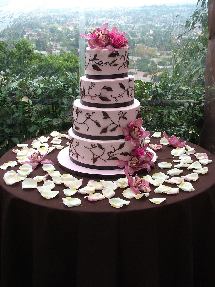 Bride e-mailed me a photo, so I don't know who to credit for the design. Pink buttercream with brown buttercream vines. Chocolate fondant leaves. Fresh flowers on top.