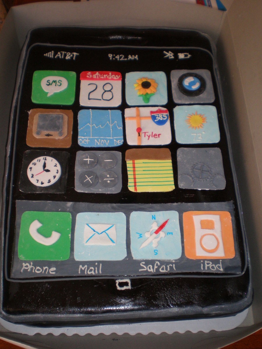 iPhone cake. when i got the order I thought that it would be pretty easy...I was wrong the cake took me two days to decorate. I am happy the way it turned out except that my apps turned out bigger that i thought and makes the cake look short.