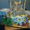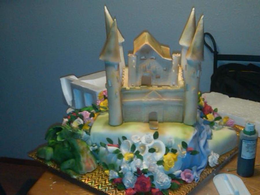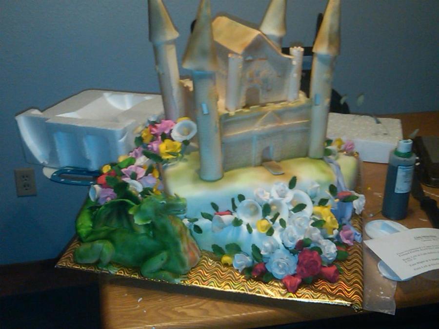 I made this cake for myself for my bday... it wasn't particularly a special numbered bday, but I just wanted to make something special that I would like, and so I decided to make my own cake... it was a HIT at the restaurant! The Cake was golden Vanilla with cream fillining, buttercream iced and overlaid with mmf. The dragon was rice crispy covered with mmf, all the flowers were gumpaste, the castle was pastillage sugar and royal icing... and everything was airbrushed to give it age and depth. I learned a LOT about making this type of cake, it was very challenging (my first time with this type of structure)... but I'm all ready to make another!!(please exucse the mess, I had to take a quick pic before i left for the restaruant and I had just finished the cake moments before I had to leave)