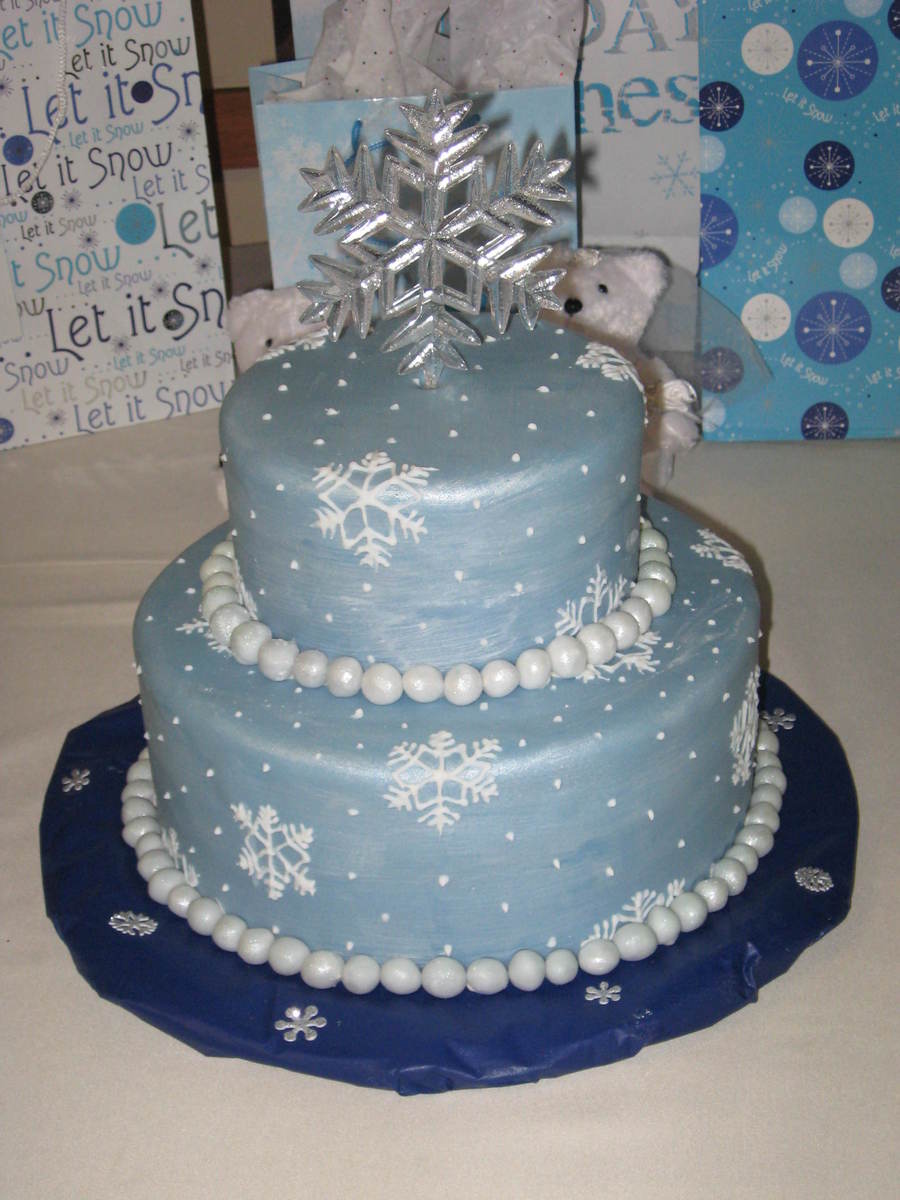 Vanilla cake with ganache filing. Covered in fondant with royal icing snowflakes.