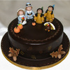 It was chocolate cake with chocolate filling and covered with chocoalate fondant. I rubbed some crisco into fondant to make it shine. Figures were made from mixture 50/50 fondant and gum paste.