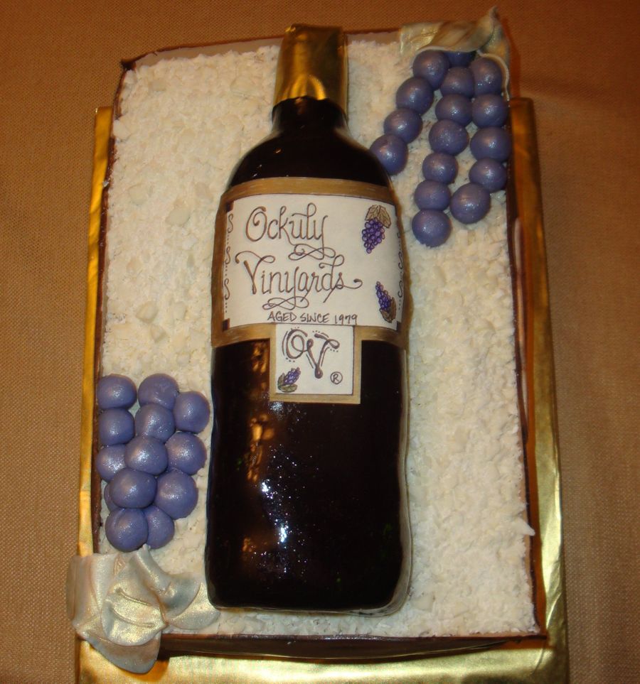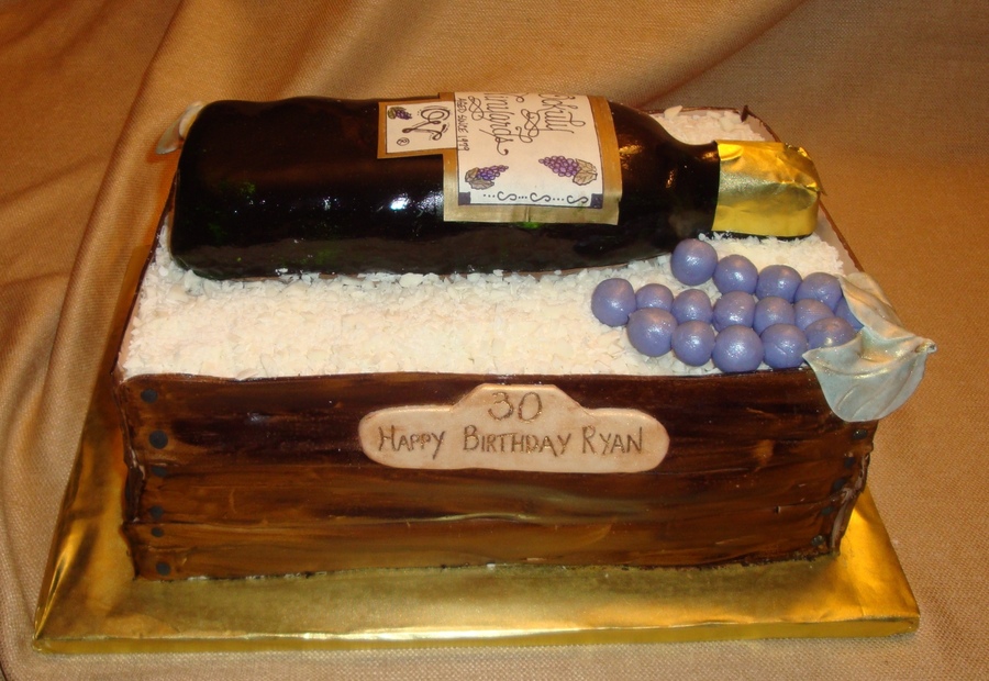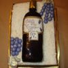 For a surprise party for a wine lover. The cake was chocolate filled with oreo mousse, covered in chocolate BC and fondant painted to look like wood grain. The crate "filling" was shaved white chocolate. The wine bottle was RKT covered i n fondant and painted. The label was hand drawn. It was a hit!