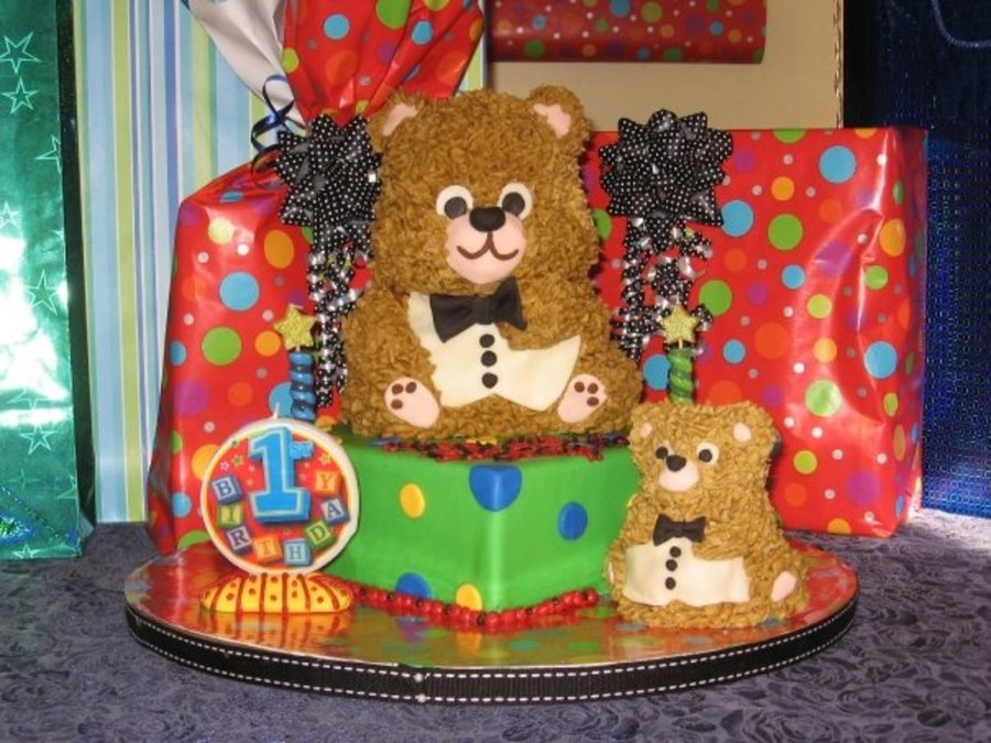 This was for my sons first birthday. The little one in front is his smash cake. It was perfect I think the smash cake was his favorite part of the birthday! He was wearing a vest and bow tie to match the bear it was adorable hope you like it.