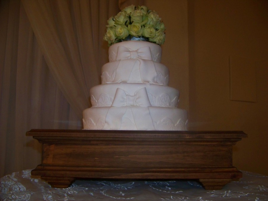 PERFECT WHITE FONDANT CAKE WITH A BUNCH OF ROSES AND A SOLID WOOD BASE.