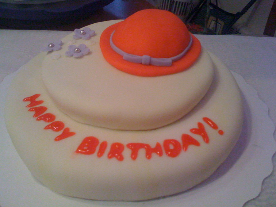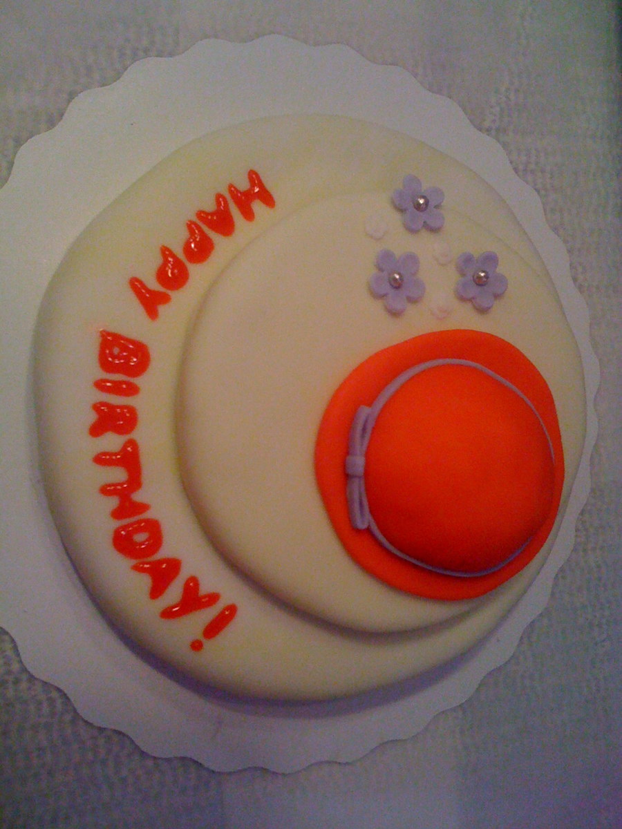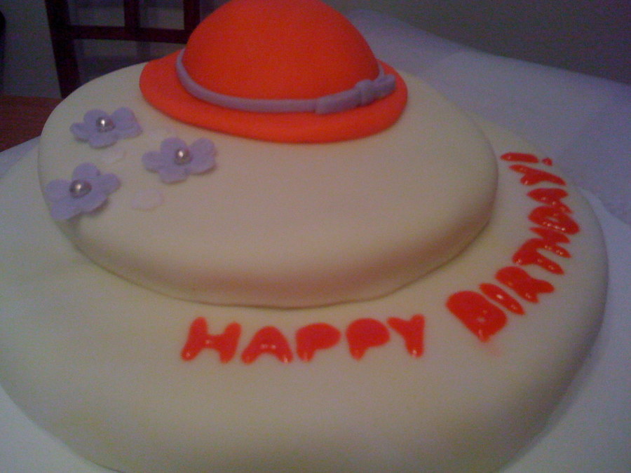 This is a cake for my Nan's bday. She's part of the Red Hat Society so it seemed fitting to have a red hat on the cake. I tried yellow and white fondant marbling but I may have kneaded too much because the marble look I was hoping for was really subtle. Perhaps if someone has a suggestion on good technique to marble two colours in fondant, please let me know. Thanks