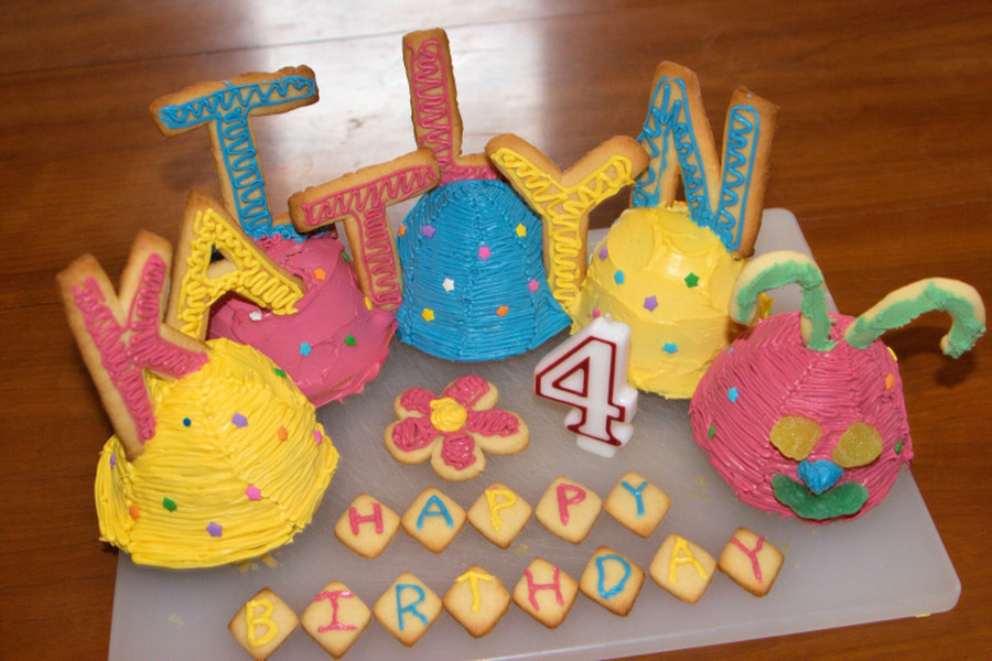 I'm adding a description of how I made the cake: I bought a cake pan that had 4 small dome-shapes in it (to make 4 mini dome-shaped cakes). I used it twice to get enough "segments". I set them all next to each other and iced them. I made sugar cookie dough, rolled it, and used a knife to cut out letters, the antennae, and a flower (the best I could, at least). I used a small diamond-shaped cookie cutter and cut out a bunch of them to write "Happy Birthday". My letters came out so huge that I had to use little wooden skewers behind them to keep them from falling over.