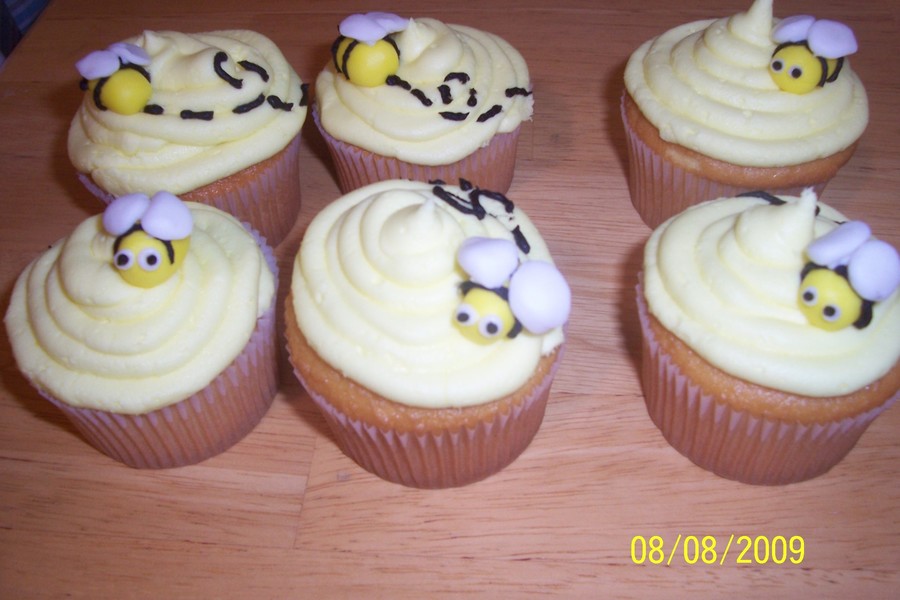 Cupcakes with Fondant bumble bee's on top! Would go perfect with a pooh cake! Many thanks to ccers on here but mostly to lynsey and her bee hive cupcakes!