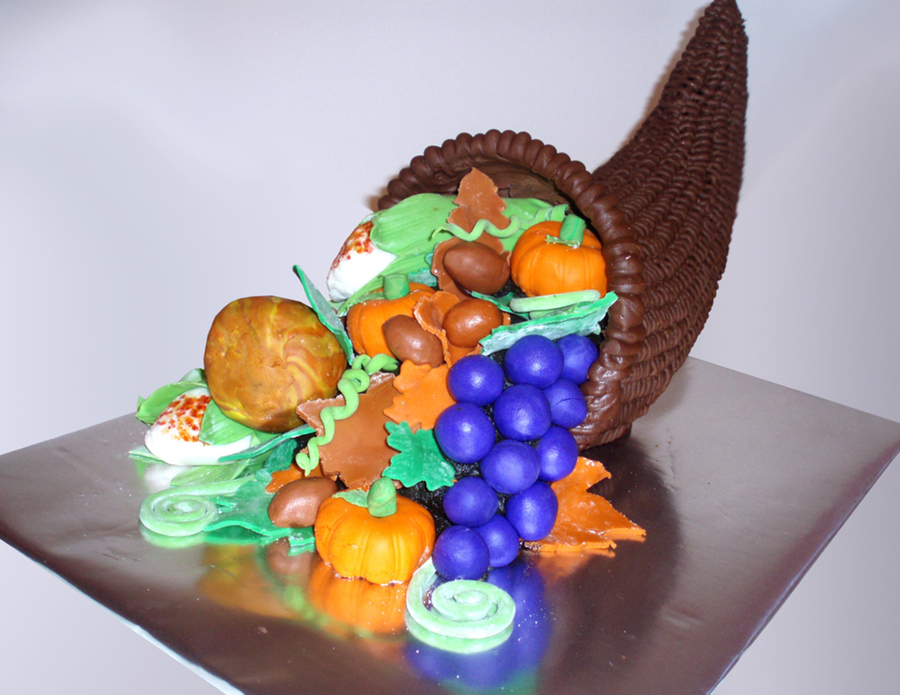 Cornucopia basket is royal icing with chocolate cake with buttercream icing. The corn is a twinky and the pumpkins are small chaocolate donuts. Leaves are mm fondant and gumpaste, grapes are fondant. Please let me know what you think.