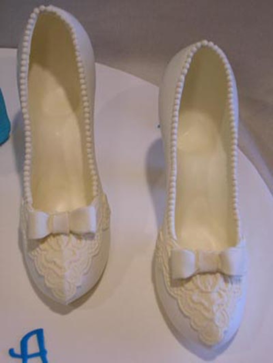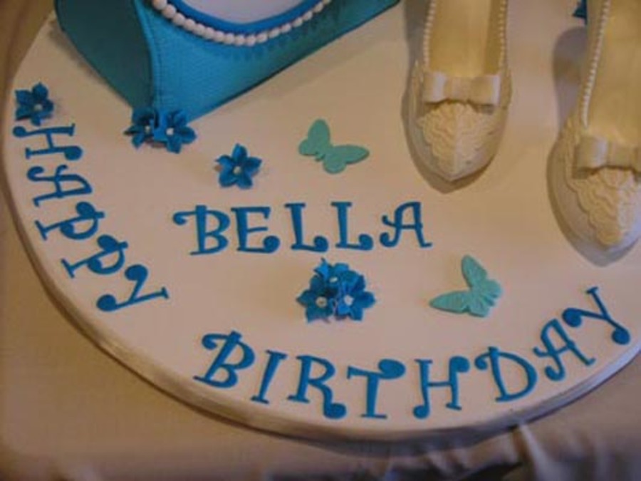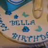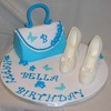 Requested by my favorite six-year-old, who, when she found out I did her caramel apple cake last year told me "when I turn six I want a blue purse cake with fabulous shoes." Gotta love it! The blue purse is carved and covered in fondant, fabulous shoes are poured chocolate with chocolate pearls, lace and bow (based on Jennifer Dontz's signature design.) Funky tappits, fondant flowers and butterflies complete the look. Thanks for looking!
