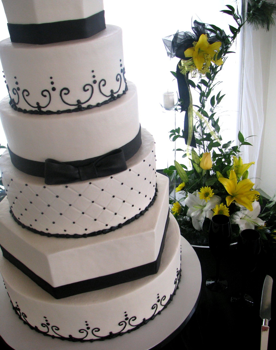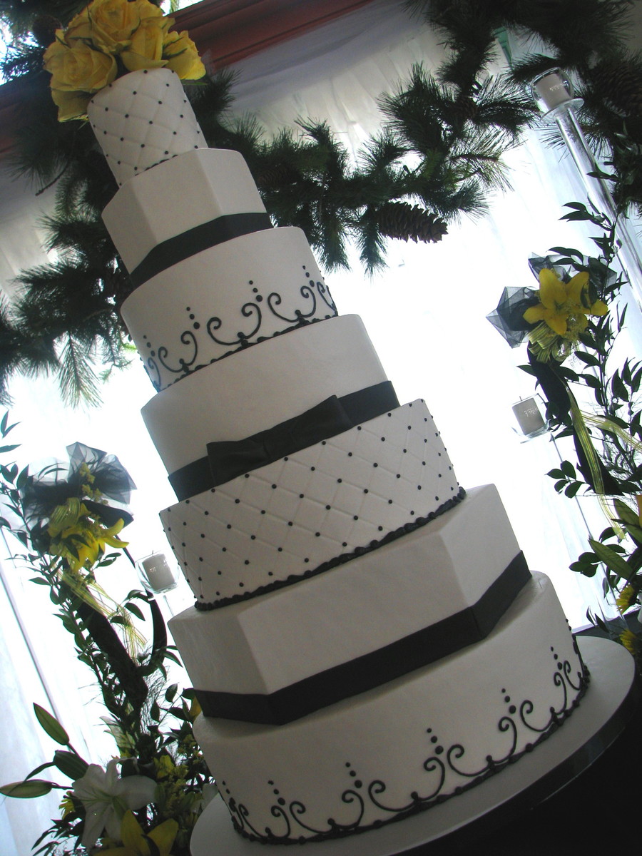 7 tiers delivered 55 miles and it was nerve wracking! Buttercream with black piping and fondant ribbons. A fondant bow on the center tier, fresh yellow roses. One of my favorite cakes of this year, maybe ever! Thanks for looking!