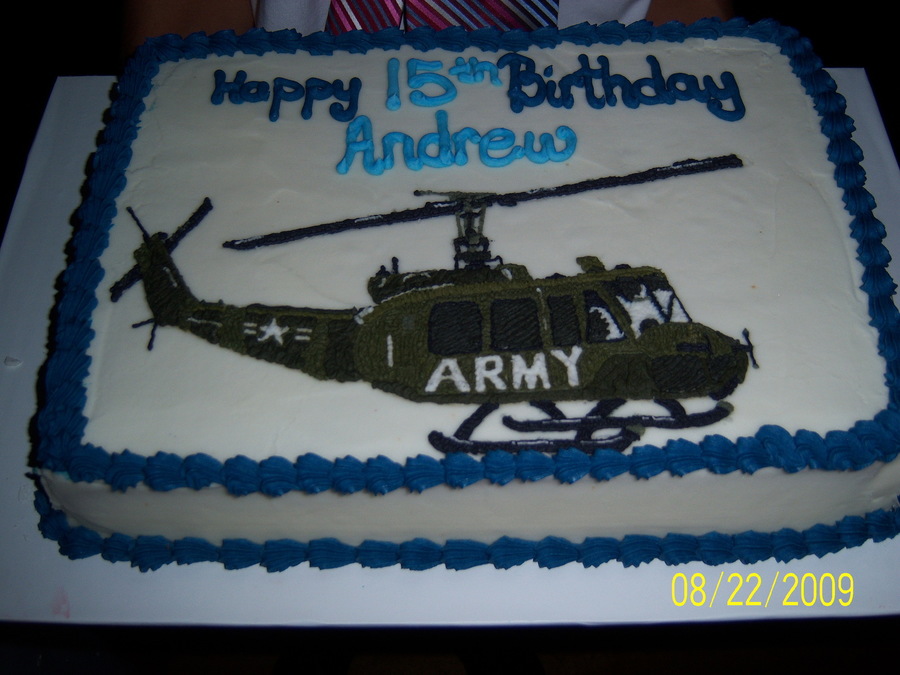 This cake was ordered for a young man who was going to join the Civil Air Patrol. My son did the artwork on this cake for him. This young man was so excited. he said it looked just like the helicopter.