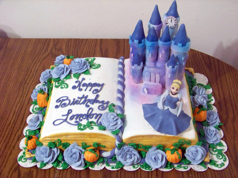 Made with book pan. Castle is made from RKT. Cinderella and pumpkins are made from gumpaste. Buttercream roses.