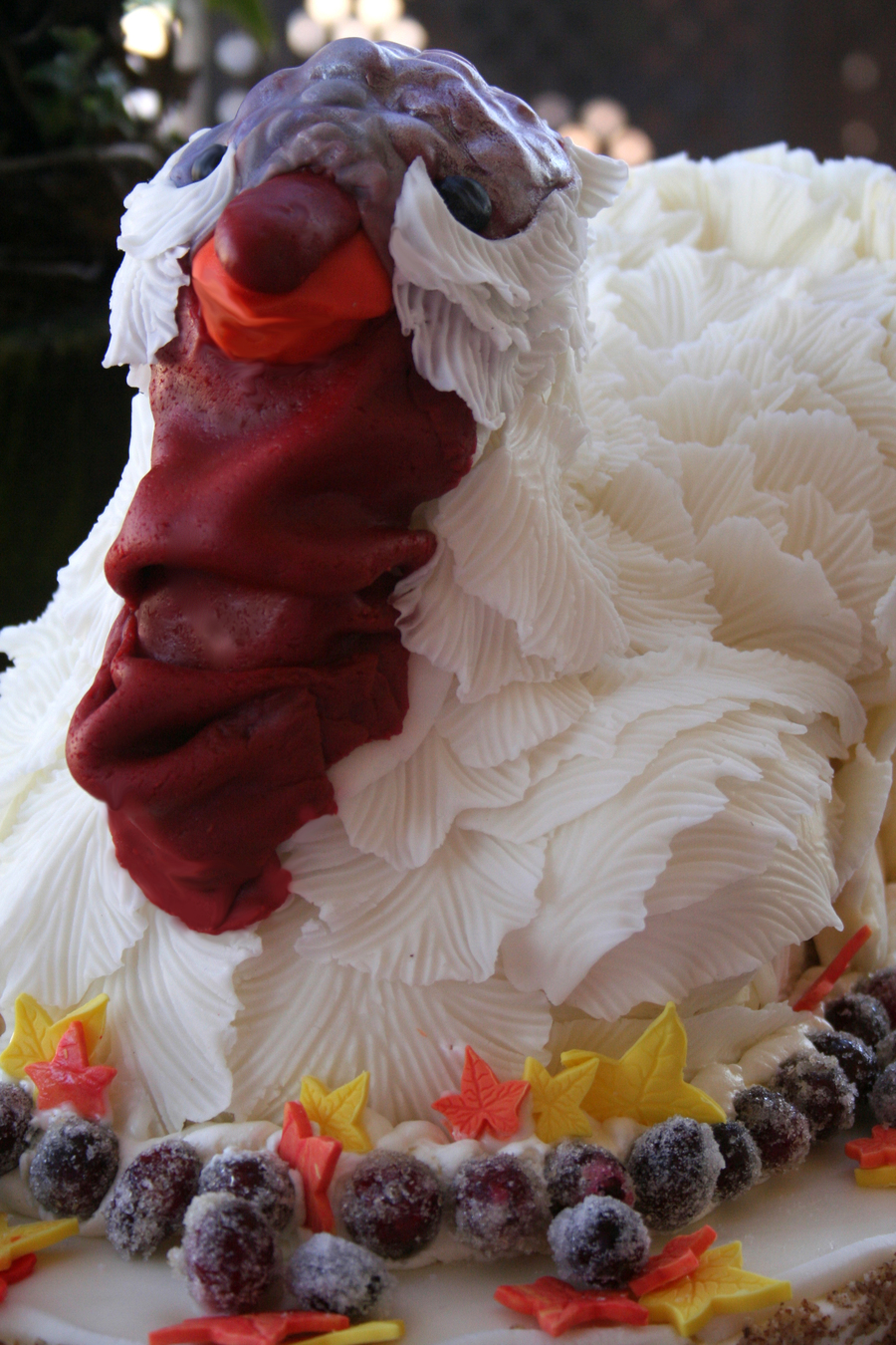 THIS WAS MY FIRST TRY AT A FONDANT TURKEY. THE CAKE WAS A HUMMINGBIRD CAKE WITH CREAM CHEESE (A BIT) MIXED WITH A LOT OF GREAT BUTTERCREAM. THE TURKEY FEATHERS AND THE REST OF THE BODY WAS DECORATED WITH MARSHMALLOW FONDANT. THE FEATHERS TOOK ME 1 1/2 DAYS TO MAKE.